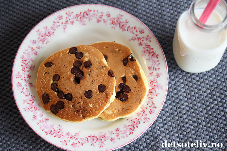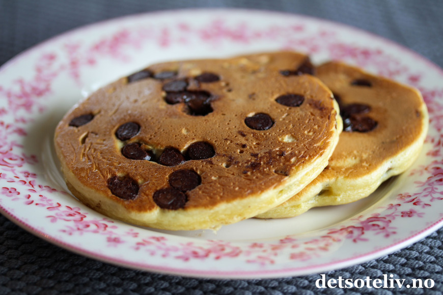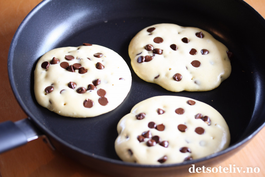 Legg opp til å steke 3-4 lapper om gangen. Dryss på litt ekstra sjokolade mens lappene steker på den ene siden. Snu lappene og stek dem videre på den andre siden til de er gylne.