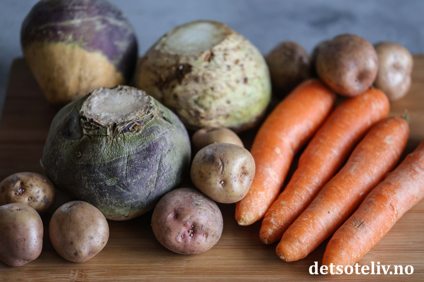 ♥ Jeg brukte her rotgrønnsaker (en kombinasjon av gulrøtter, kålrot og sellerirot). Mengdeangivelsen er ikke så nøye, så bruk det du måtte ha tilgjengelig. Du kan også tilsette 1 løk eller 1 purreløk.