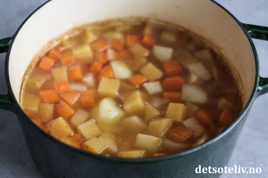 Ha først gulrot-, kålrot- og persillerotbitene i gryten. Fyll opp med kjøttkraften. Sett på lokket og la grønnsakene småkoke i 10 minutter.