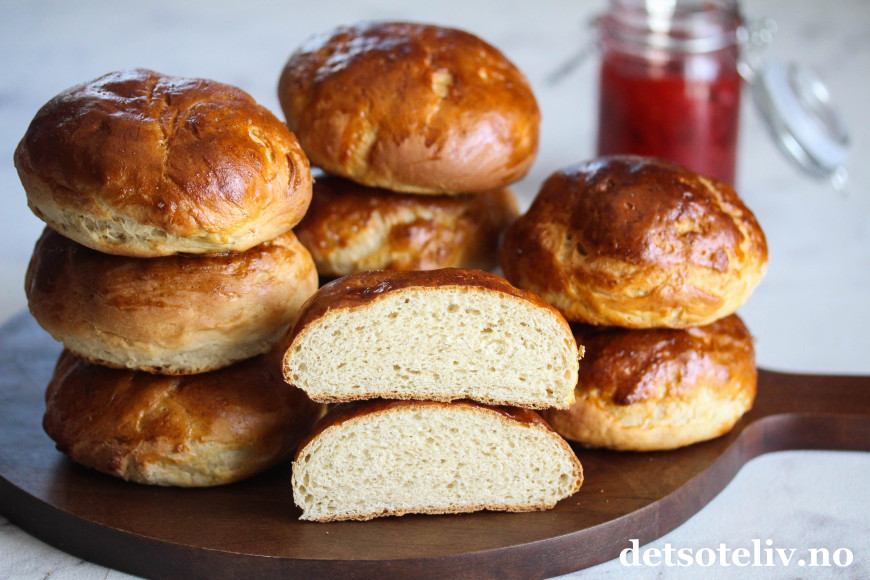 Pisk egget lett sammen og pensle over de etterhevede bollene. Stek bollene nederst i ovnen ved 225°C i 12–15 minutter, eller til de har gyllenbrun farge. Avkjøles rist.