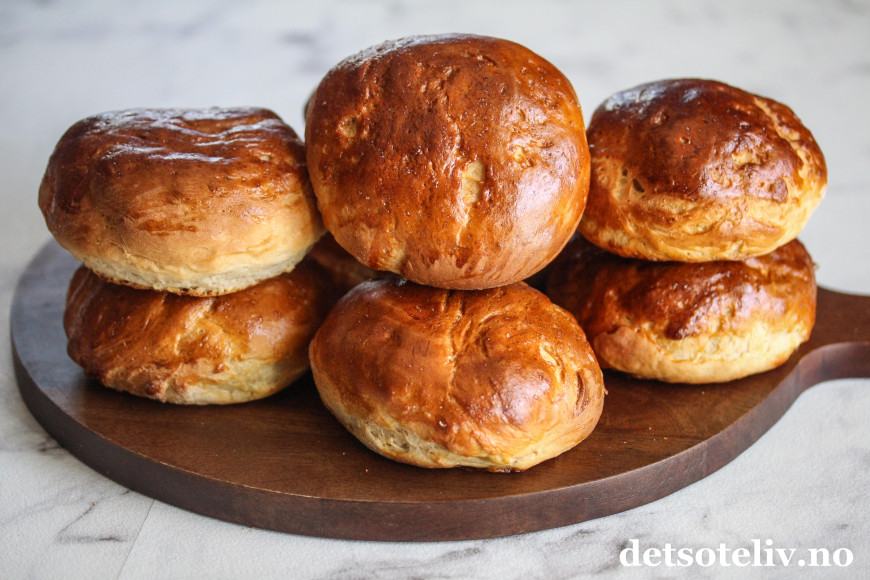 Stek bollene nederst i ovnen ved 225°C i 12–15 minutter, eller til de har gyllenbrun farge.