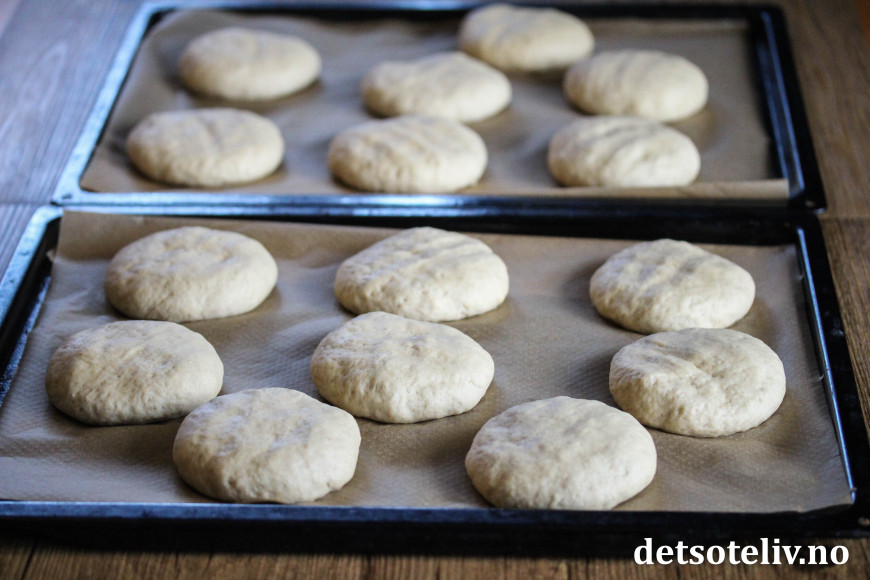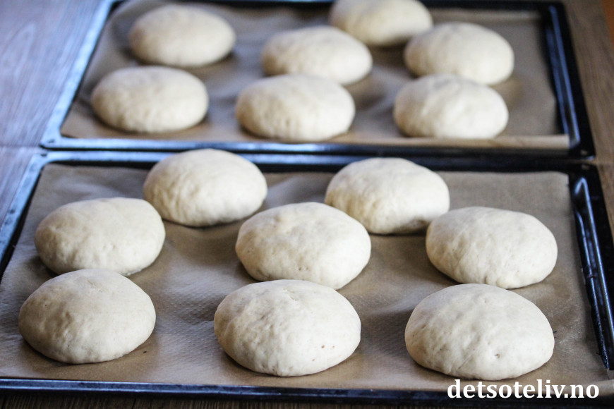 Del deigen i 15 like store emner og form runde boller, som så trykkes flate.