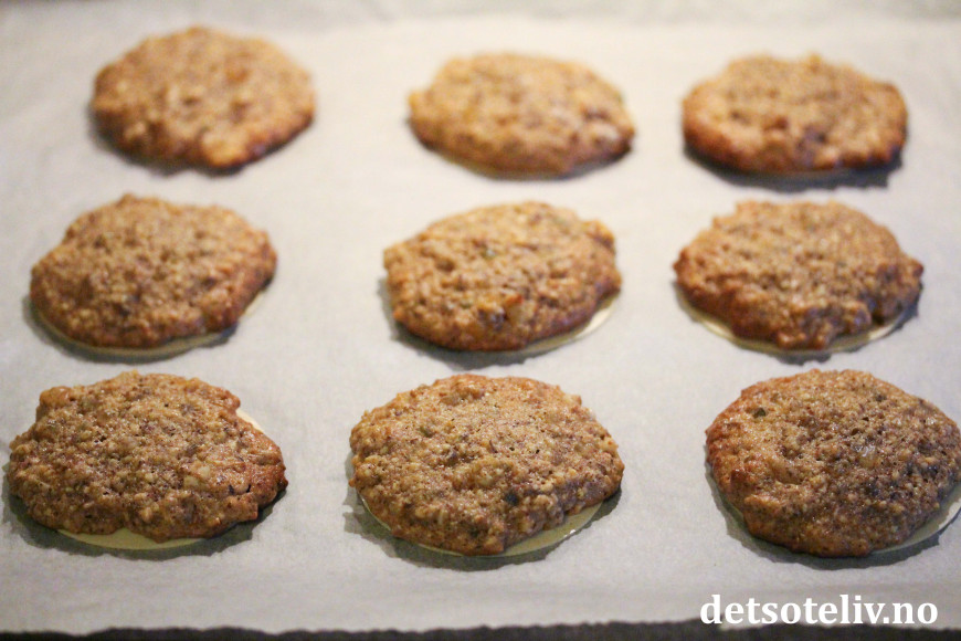 Hvis du har oblater, legges disse utover en bakepapirdekket stekeplate. Legg en stor spiseskje deig på hver oblat. Dersom du ikke har oblater, har du deigen rett på bakepapiret. Stek kakene midt i ovnen ved 150 °C i ca. 20 minutter. Avkjøl kakene til de er helt kalde.