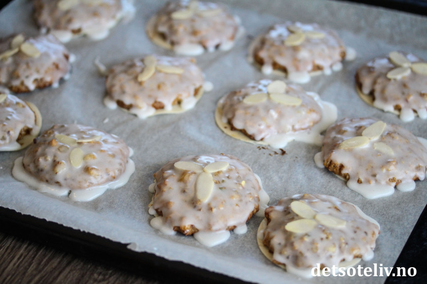 Smør toppen av kakene med enten en tynn melisglasur laget av melis og melk, eller sjokoladeglasur laget av lys eller mørk sjokolade som er smeltet sammen med litt delfiafett. Pynt med mandelflak eller halve, skåldede mandler. Legg kakene på en rist så overflødig glasur renner av og la glasuren stivne. Legg kakene i en kakeboks eller plastpose, og oppbevar dem kjølig slik at de ikke blir klissete. Kakene er kjempefine å fryse.