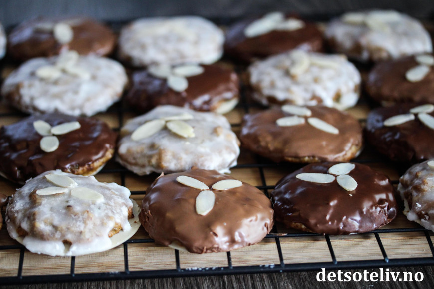 Pisk eggene og brunt sukker til en tykk eggedosis. Smelt honningen og vend inn. Mal mandler og hasselnøtter i food processor slik at de blir grovkornet. Bland krydder, vaniljesukker og bakepulver med nøttene, og vend dette deretter inn i eggedosisen. Bland apsikat (syltet appelsinskall) og sukat med 2 ss av hvetemelet. Vend dette inn i deigen sammen med resten av hvetemelet.