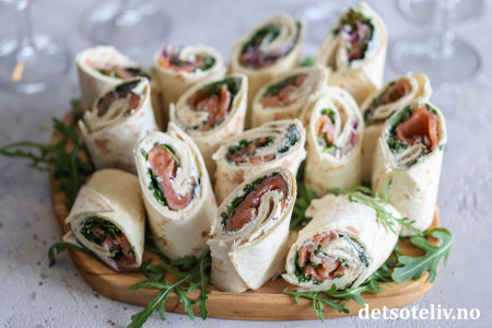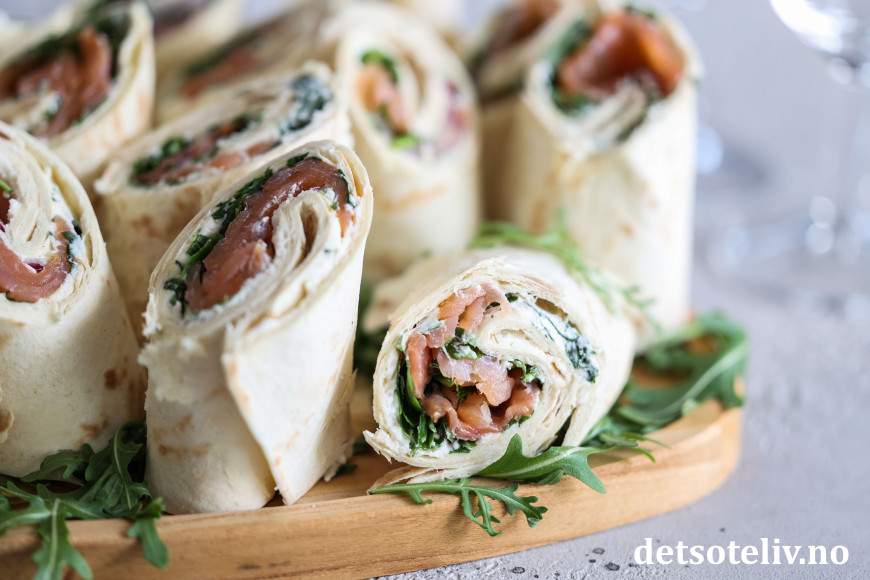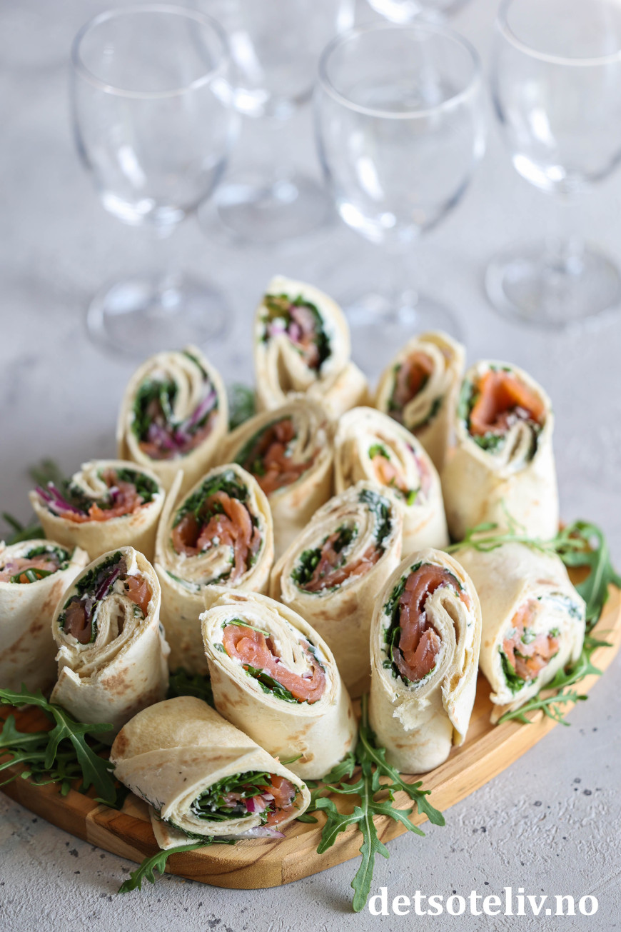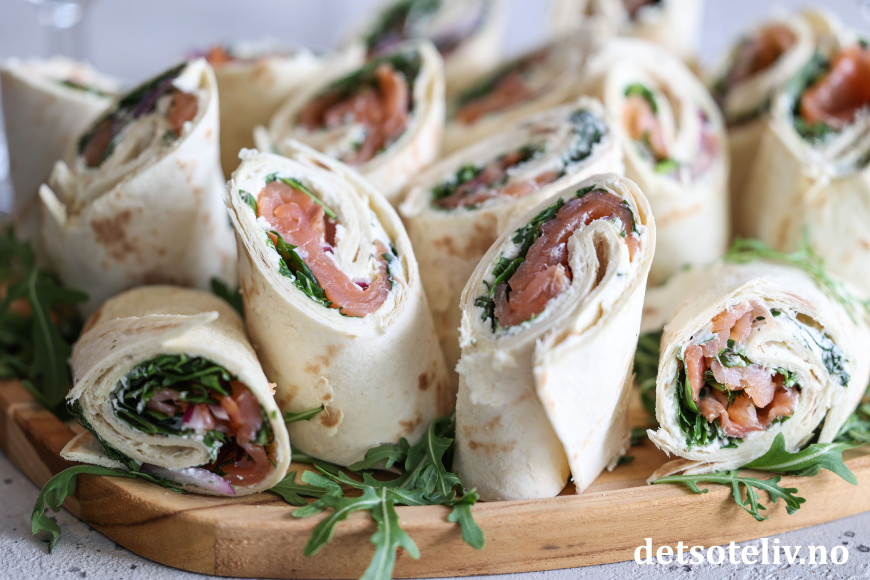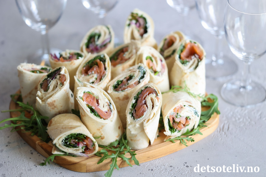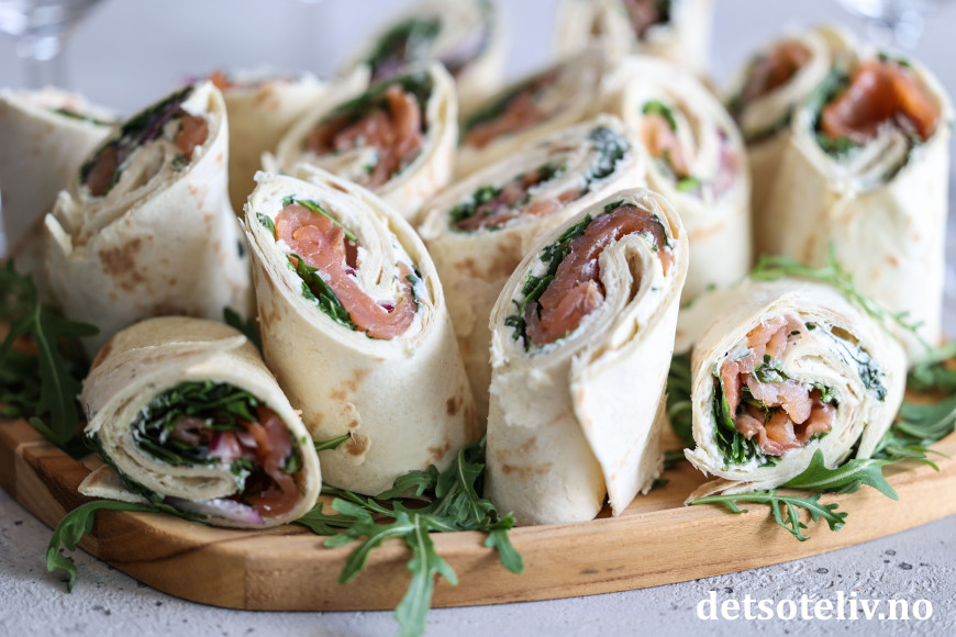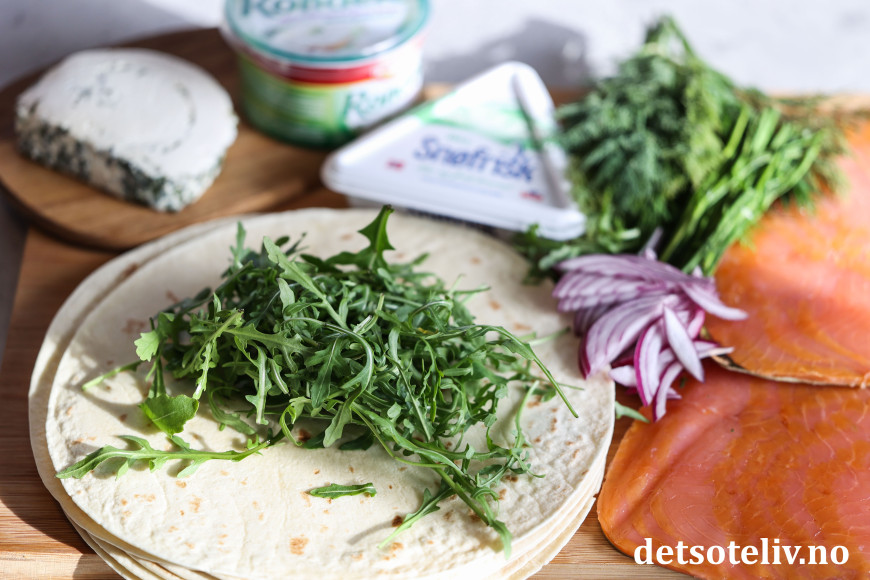 Sett lefserullene på et serveringsfat (pynt fatet eventuelt med ruccola som du måtte ha til overs).
