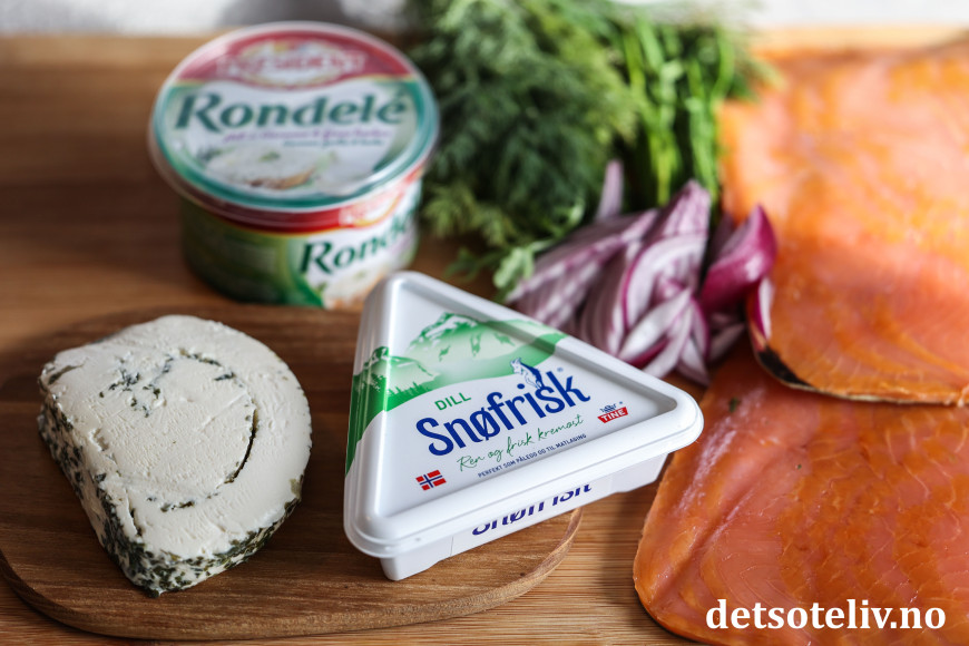 ♥ Bruk gjerne kremost med smak av urter. Jeg har her brukt Snøfrisk med dill, Rondelé med smak av hvitløk og urter og en skive av osten Le Roule med smak av hvitløk og urter. Dette er kremoster med mye smak som passer godt sammen med røkelaks, men andre varianter av kremost kan også brukes.