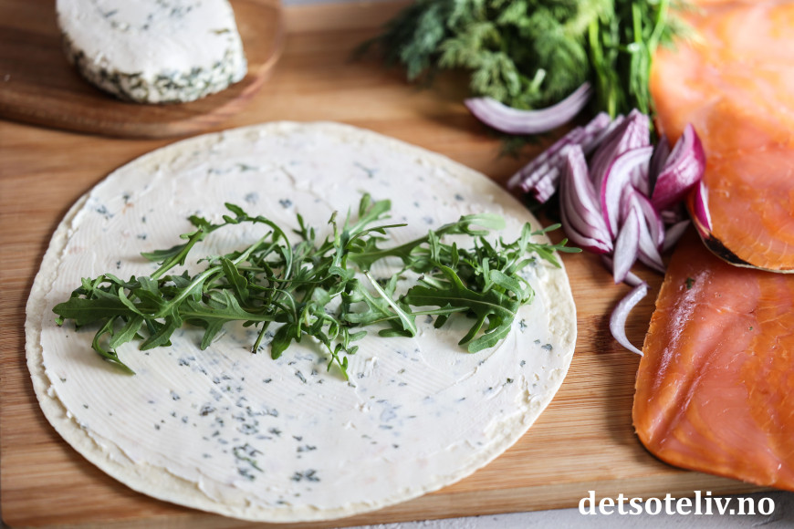 Legg en stripe med ruccolasalat på midten av lefsen.