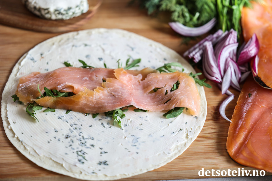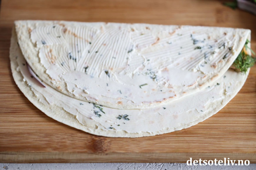 Smør først et lag kremost på tortillalefsen.