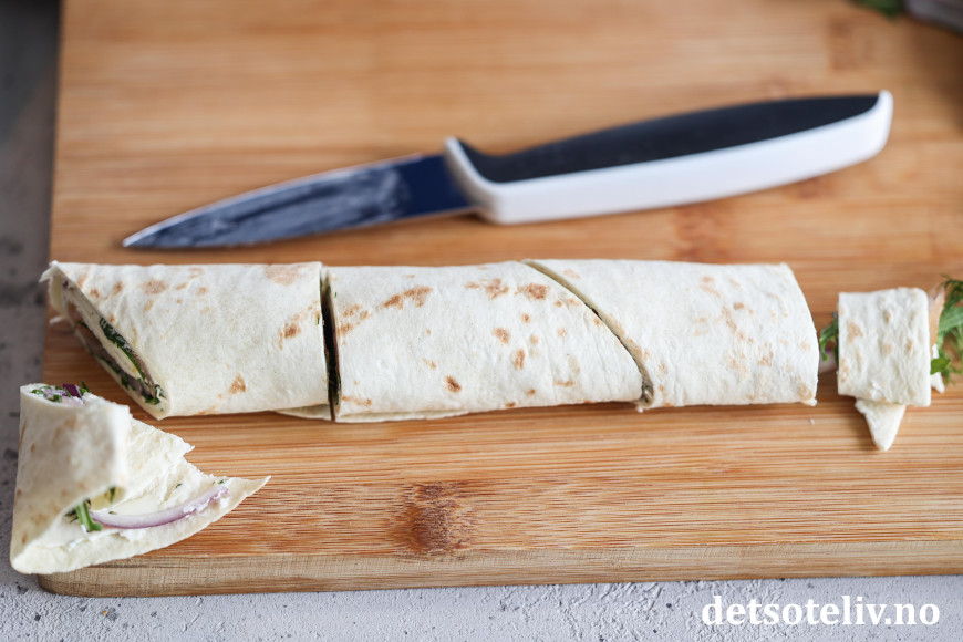 ♥ Lefserullene bør rulles stramt sammen. Jeg smører på et lag kremost også etter å ha brettet over tortillalefsen fordi kremosten fungerer som lim og hjelper til med å holde lefserullen sammen. Når lefserullene skjæres rett over i den ene enden og på skrå i den andre enden, kan de stå oppreist på serveringsfatet. Dersom du synes at lefserullene har lett for å åpne seg etter at du har rullet dem sammen, hjelper det å i stedet stable dem oppå hverandre med skjøten ned.