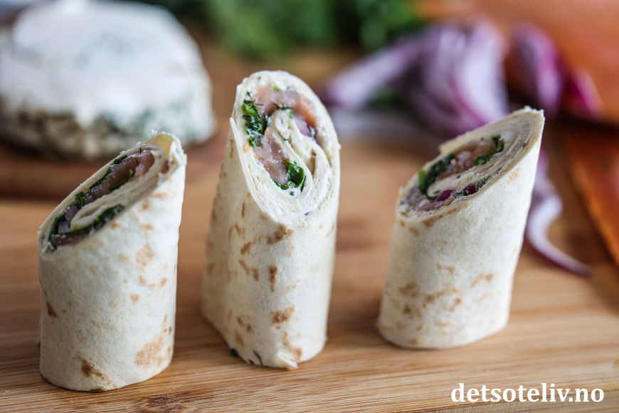 ♥ Jeg bruker her tortillalefser og ikke potetlefser. Tortillalefsene er litt tykkere og tåler noe mer fyll enn potetlefser. For varianter av lefseruller der jeg har brukt potetlefser, se Lefseruller med serranoskinke og soltørkede tomater og Lefseruller med pesto og parmaskinke.