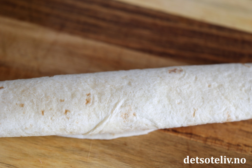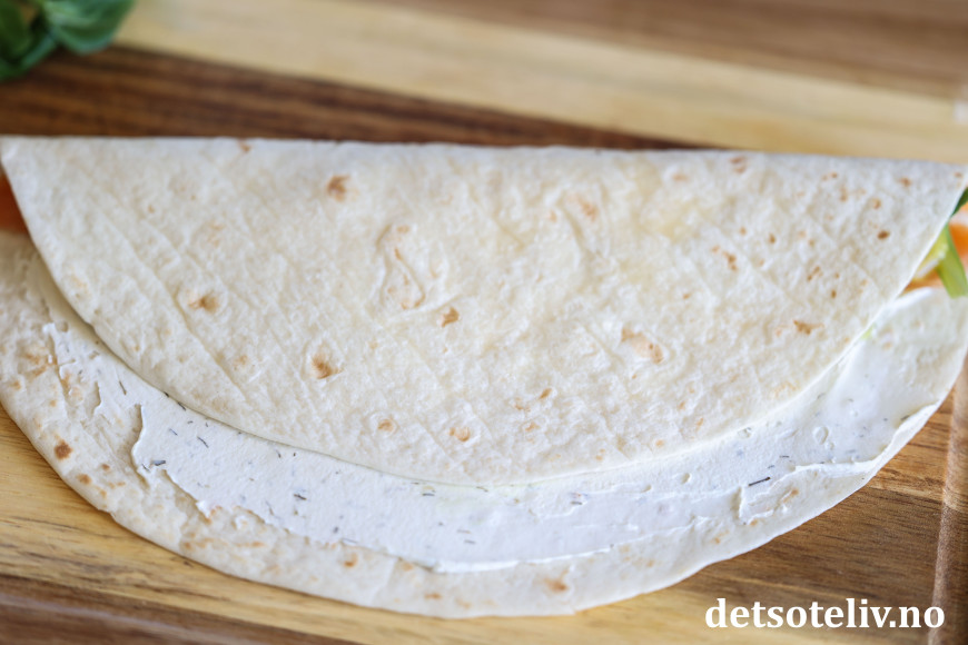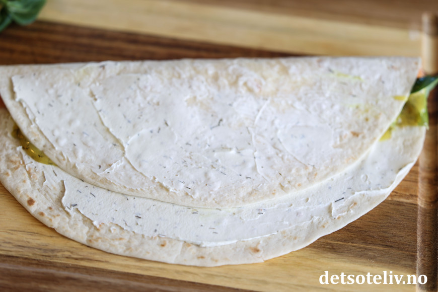 ♥ Jeg bruker her tortillalefser og ikke potetlefser. Tortillalefsene er litt tykkere og tåler noe mer fyll enn potetlefser. For varianter av lefseruller der jeg har brukt potetlefser, se Lefseruller med serranoskinke og soltørkede tomater og Lefseruller med pesto og parmaskinke.