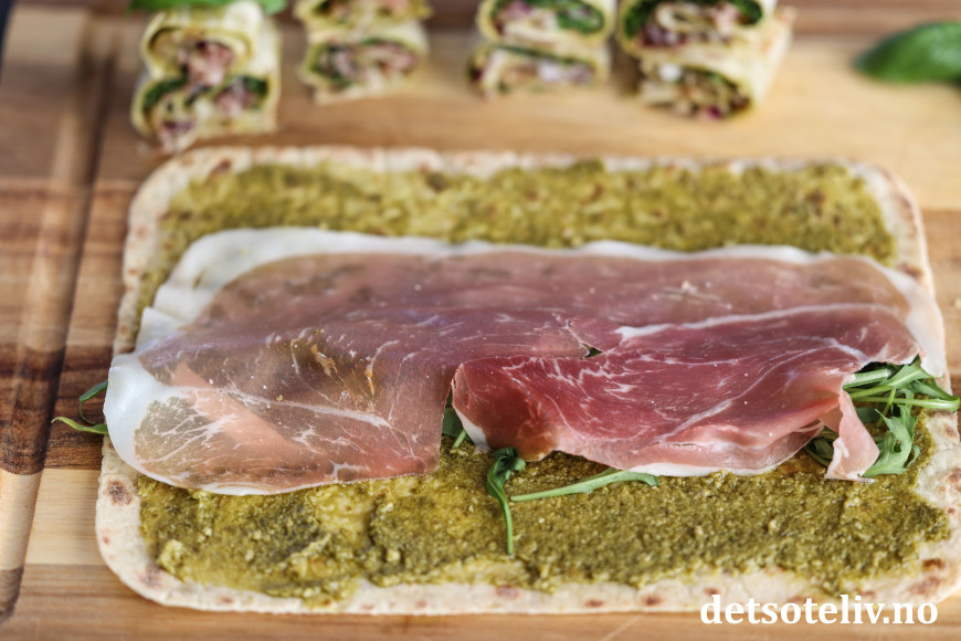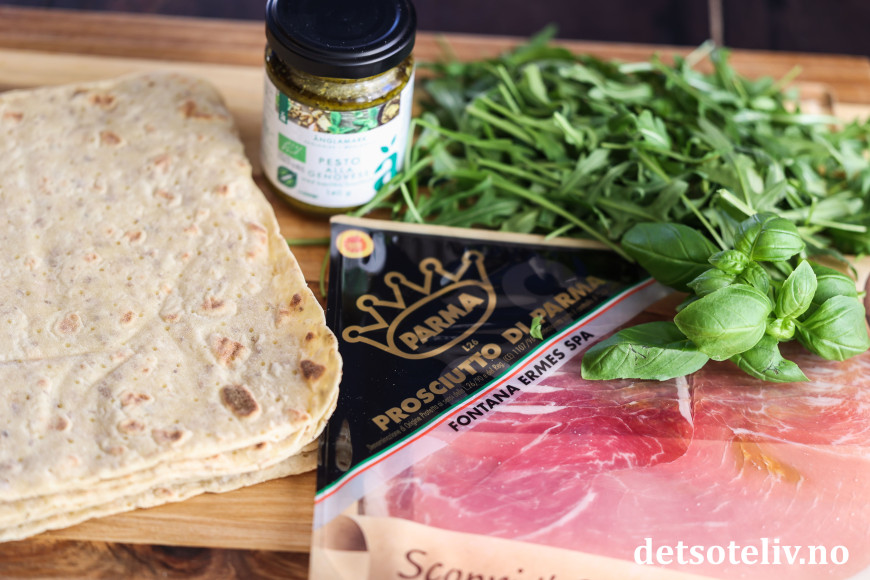 ♥ Parmaskinke passer godt sammen med pesto, men kan byttes ut med annen type spekeskinke.