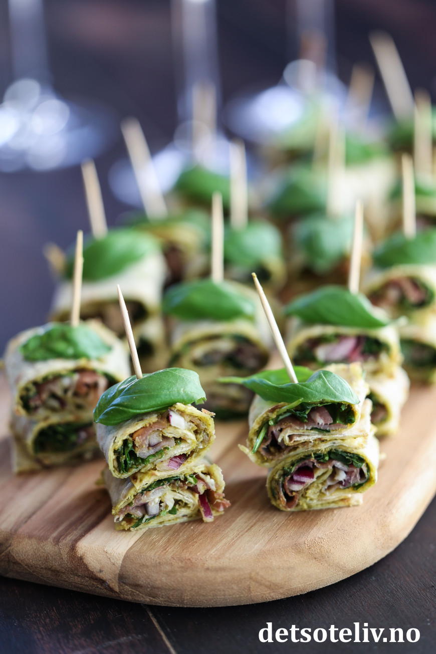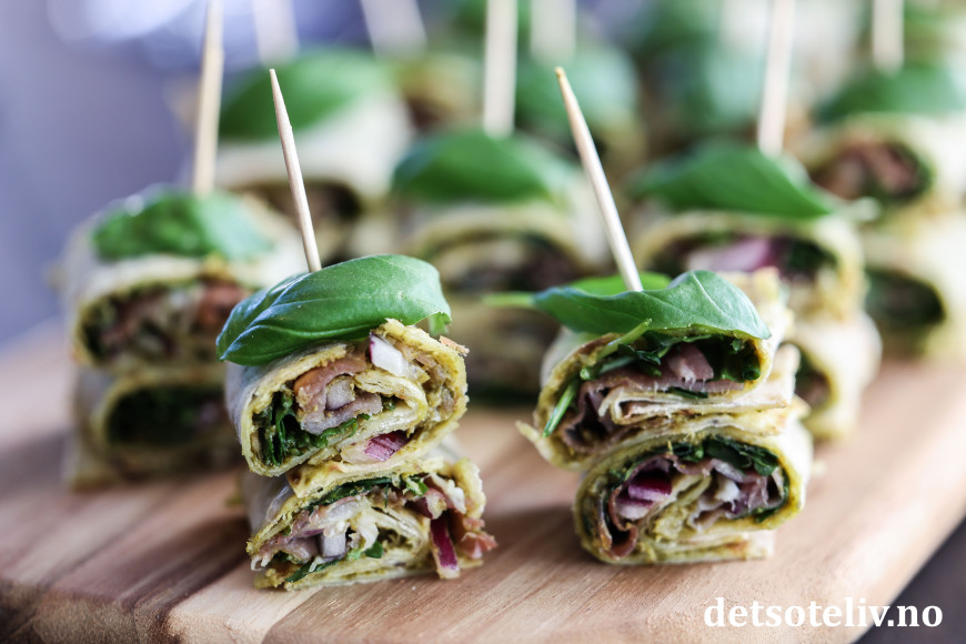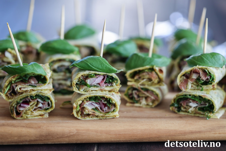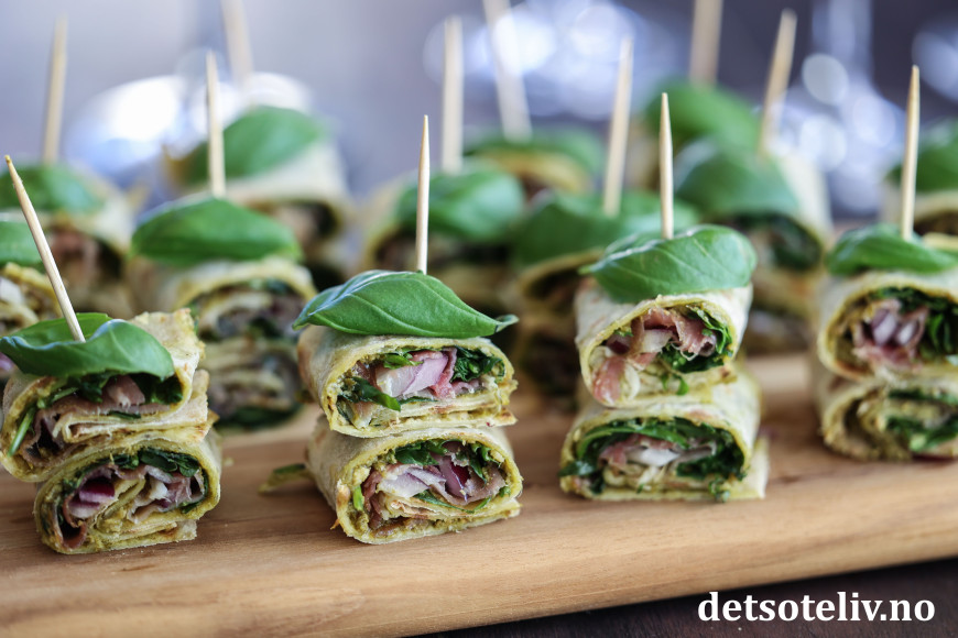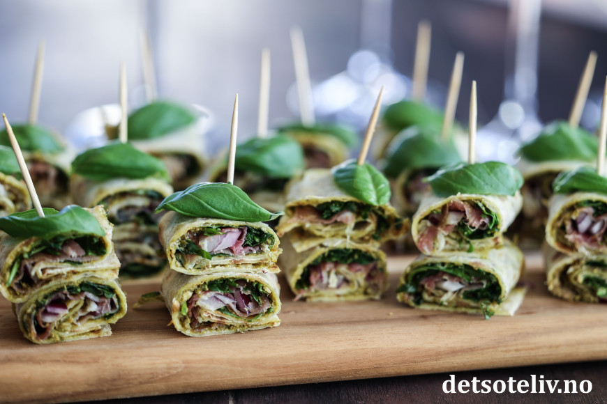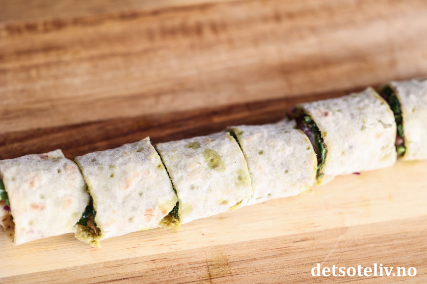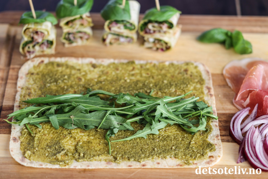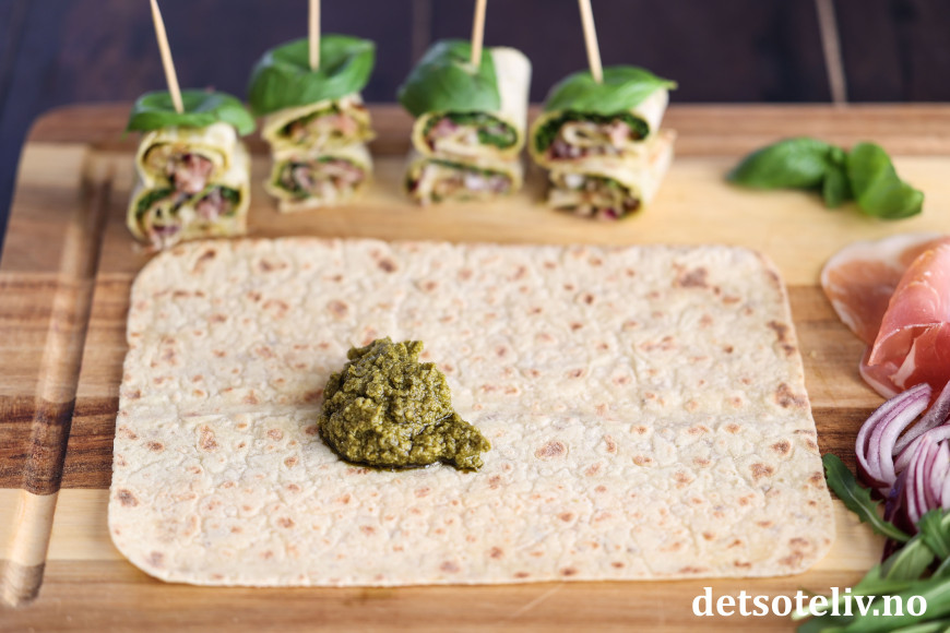 ♥ Lefserullene bør rulles stramt sammen. Det kan være lurt å ha litt ekstra pesto for hånden og så smøre noe pesto i skjøten slik at lefsene ikke åpner seg etter at de er rullet sammen. Det hjelper også med cocktailpinner for å holde rullene sammen.