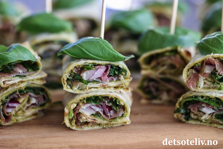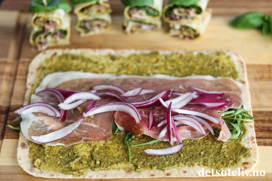 Fyllet kan varieres på uendelig mange måter. Her har jeg brukt store, myke potetlefser som jeg har fylt med italiensk basilikumpesto og italiensk parmaskinke, ruccolasalat og rødløk.