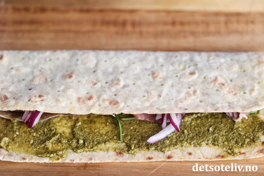 Rull lefsen stramt sammen (ha litt ekstra pesto i skjøten, se tips).
