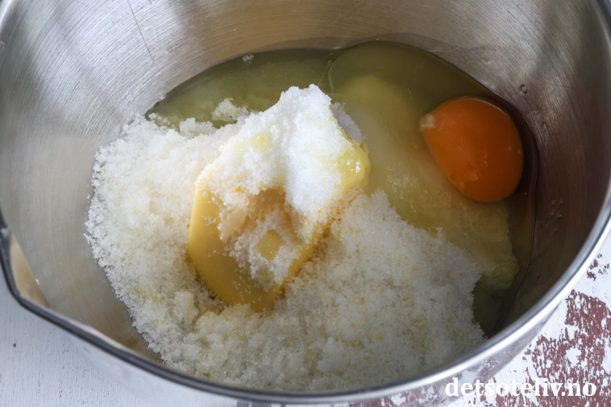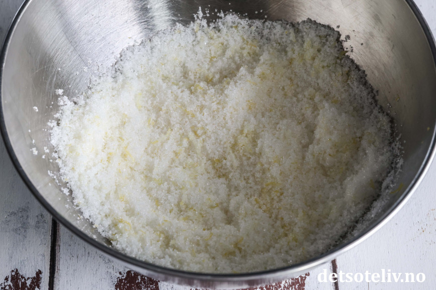 Start med å ha sukkeret i en bolle og ha i fint, revet sitronskall fra 1 stor sitron.