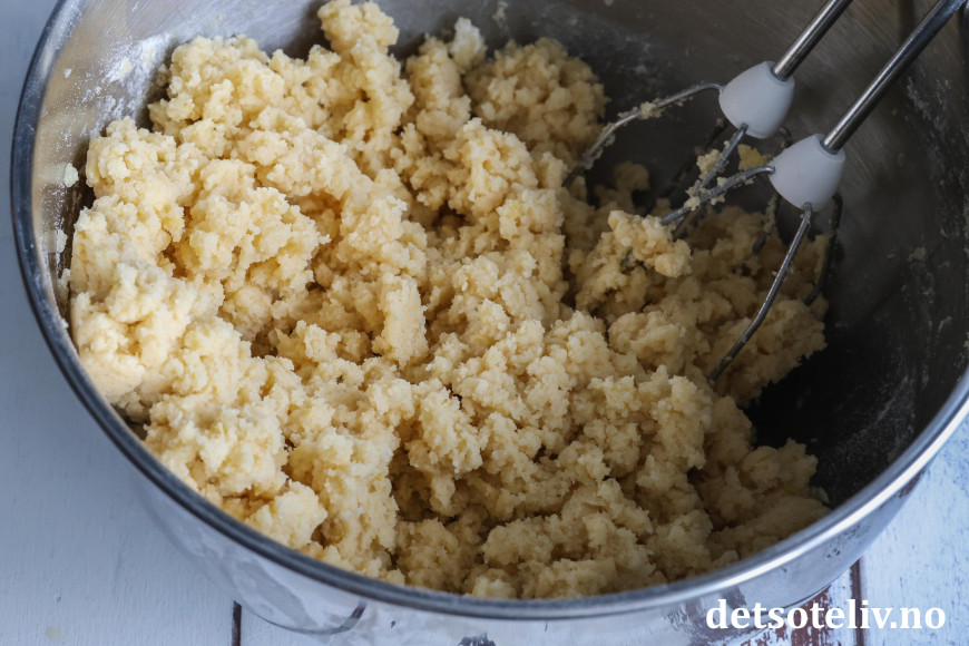 Klem deigen sammen. Det skal bli en myk mørdeig.