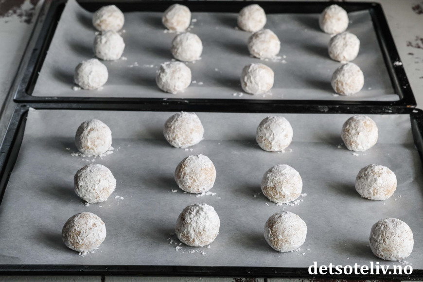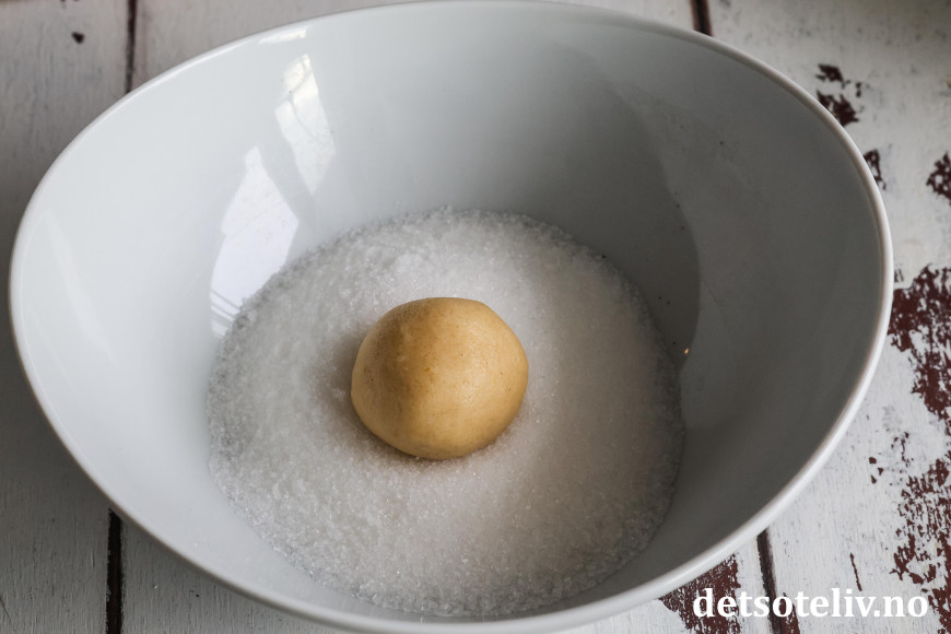 Trill deigemnene til kuler, som først trilles i sukkeret og deretter i melis (sukkerlaget gjør at melisen holder seg hvitere og penere under stekingen).