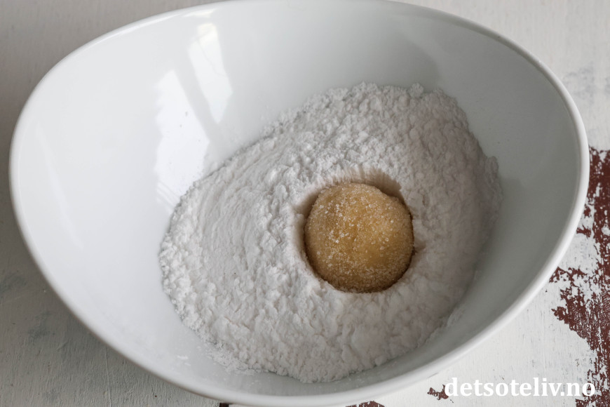 Del deigen i 24 emner (ca. 30 gram per stykk). Ha sukker og melis i hver sin skål.