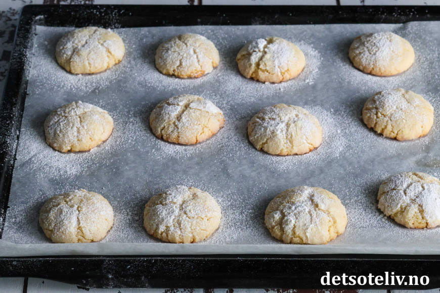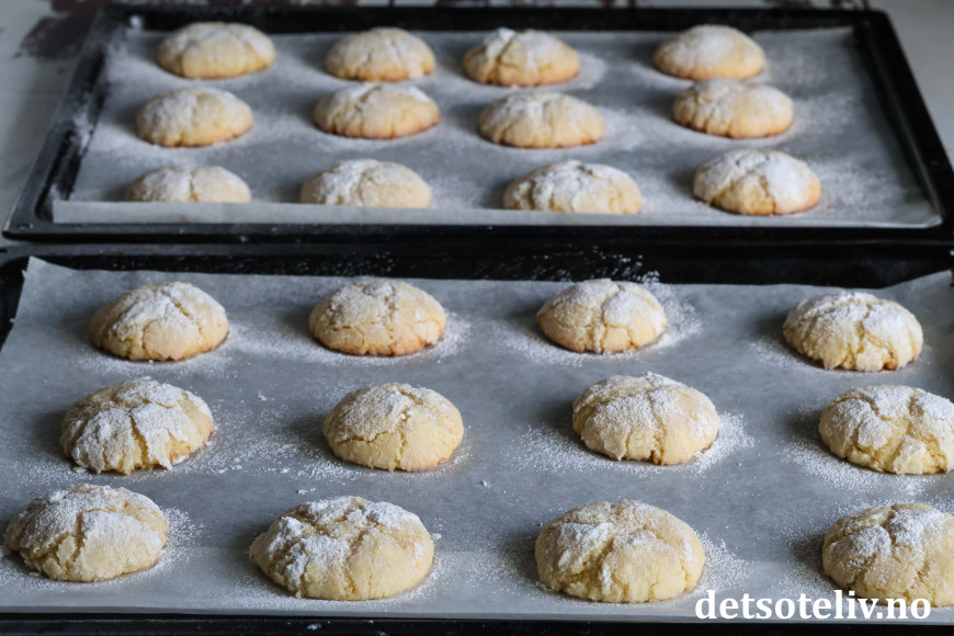 Kakene får den karakteristiske, krakelerte overflaten fordi kakene rulles i sukker og melis før steking.