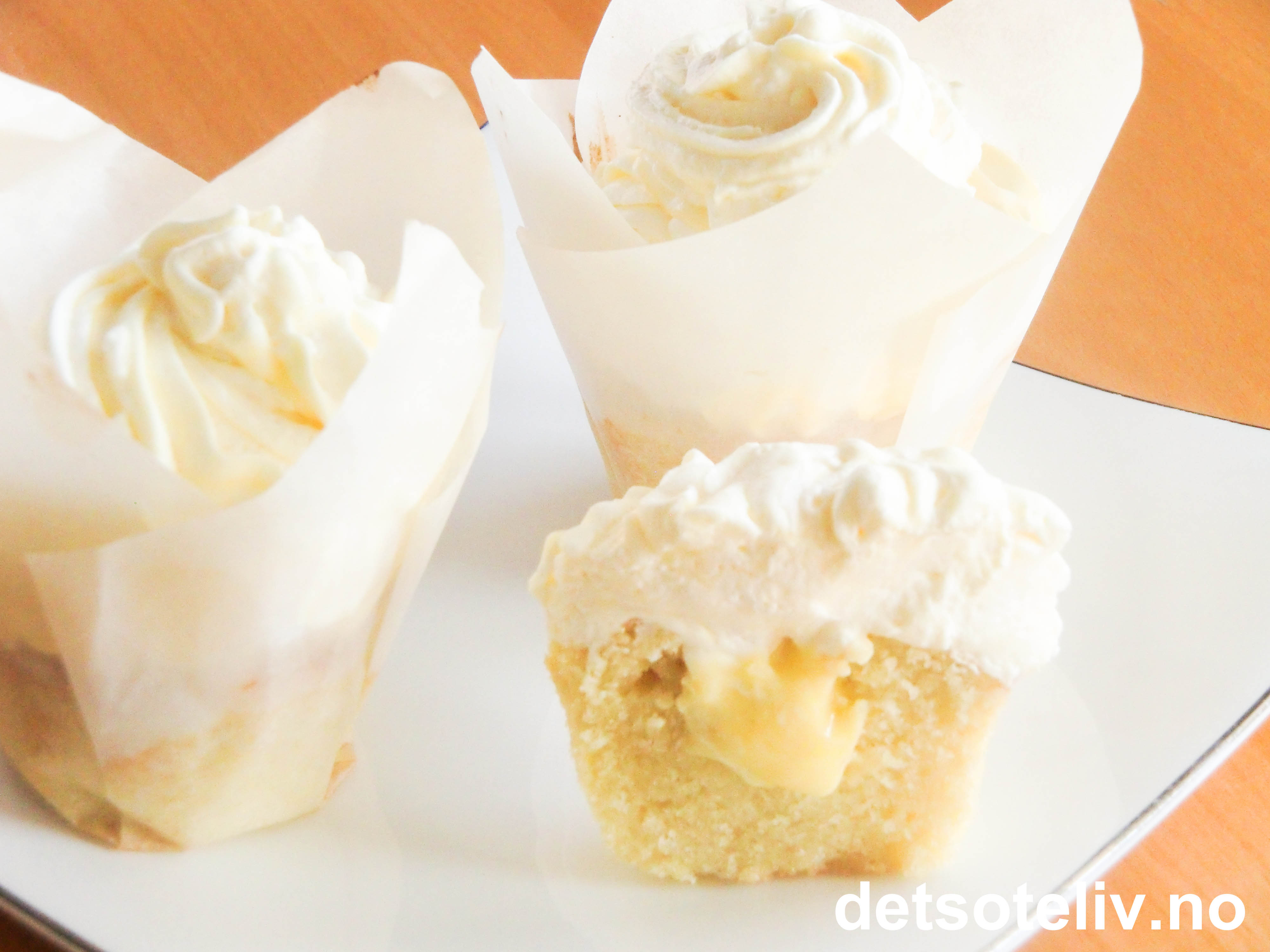 Dette er nydelige muffins smaksatt med vanilje og sitron, som fylles med fantastisk god sitronkrem (Lemon curd). På toppen luftig, pisket krem.