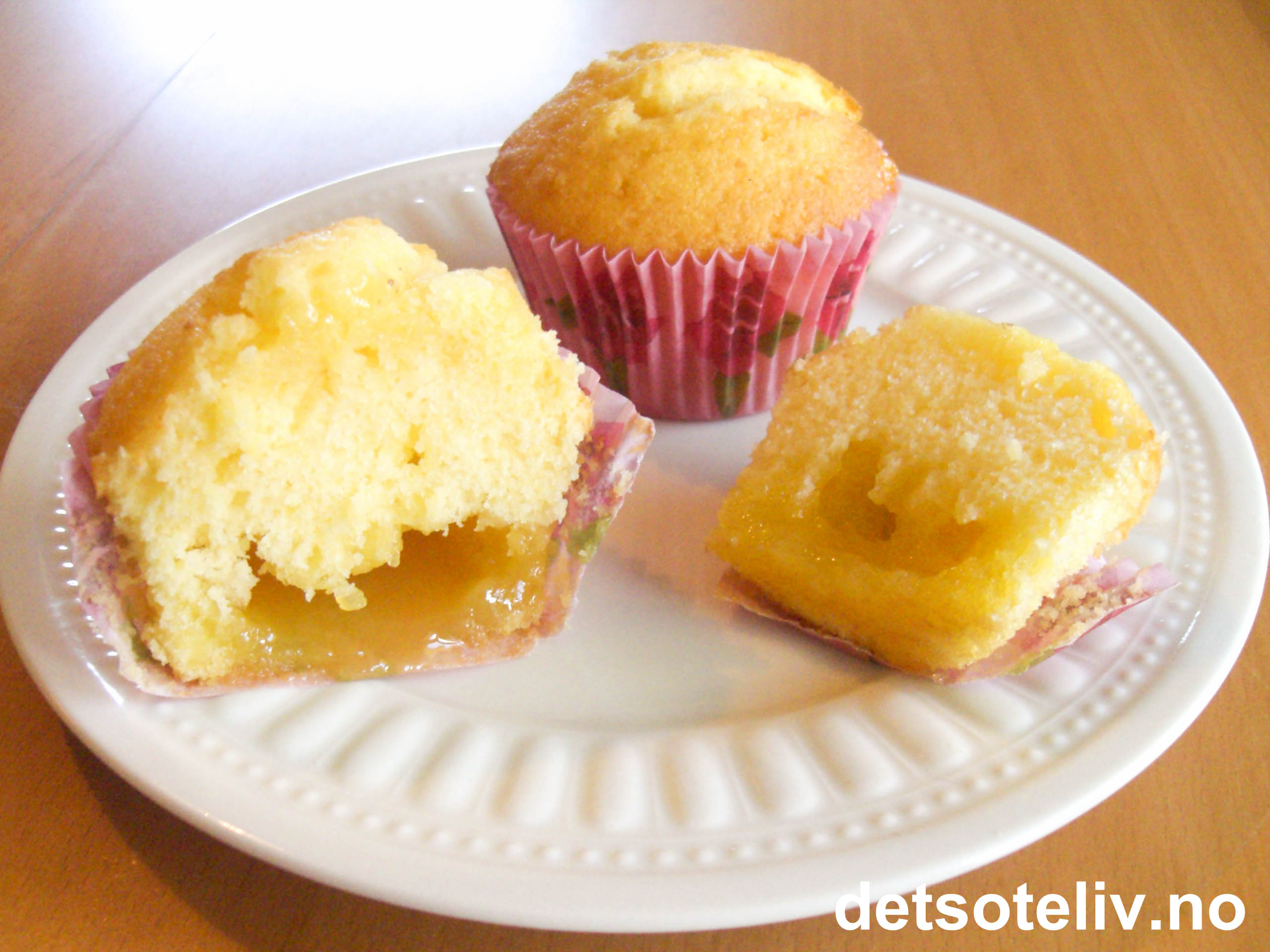 Ha papirformer i et muffinsbrett. Fyll formene med 1 spiseskje deig, slik at bunnen blir dekket. Legg så på 1 spiseskje Lemon Curd. Fordel så resten av deigen i formene.
