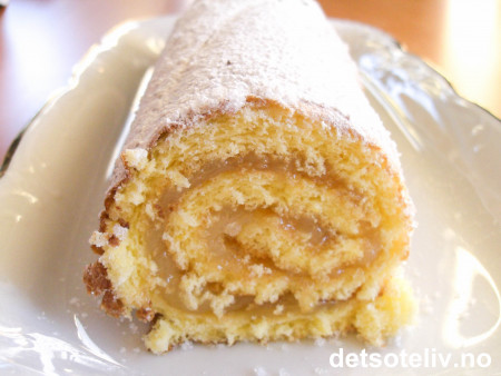 Rullekaken er holder seg i flere dager i kjøleskapet. Se også oppskrift på "Solskinnsrull".