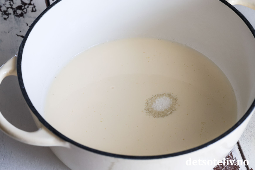 La blandingen avkjøles i romtemperatur i 10 minutter (ikke lenger). Rør jevnlig i blandingen med slikkepotten under avkjølingen. Du vil etter hvert merke at blandingen endrer konsistens og tykner litt.