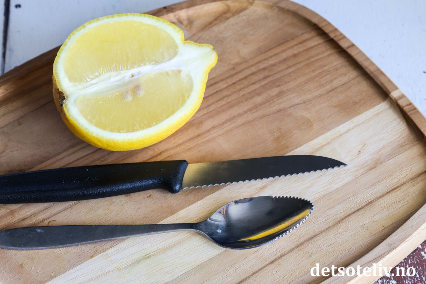 ♥ Når du skal fjerne innholdet i sitronene, kan det være nyttig å ha en liten, skarp kniv. Jeg brukte i tillegg en grapefruktskje, som er taggete på sidene. Det går imidlertid også fint å bruke en vanlig teskje og skrape forsiktig ut innholdet.