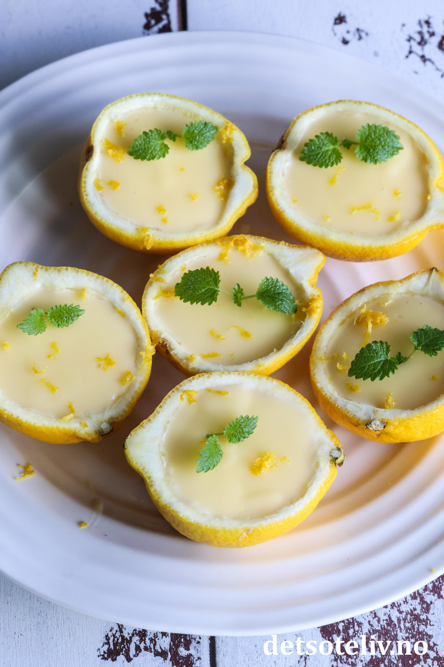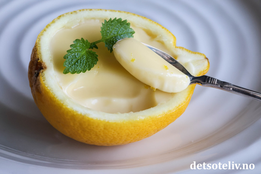 Det har blir spesielt trendy å servere desserten i halve, uthulede sitroner, men sitronkremen kan også serveres i små dessertskåler.