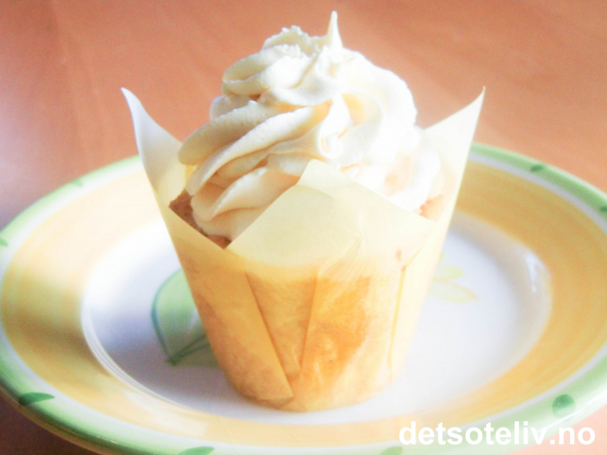 Oppskriften på krem gir middels store topper på hver cupcake. Jeg sprøytet dobbel porsjon på kaken du ser på bildet, men det holder i grunnen med normal porsjon.