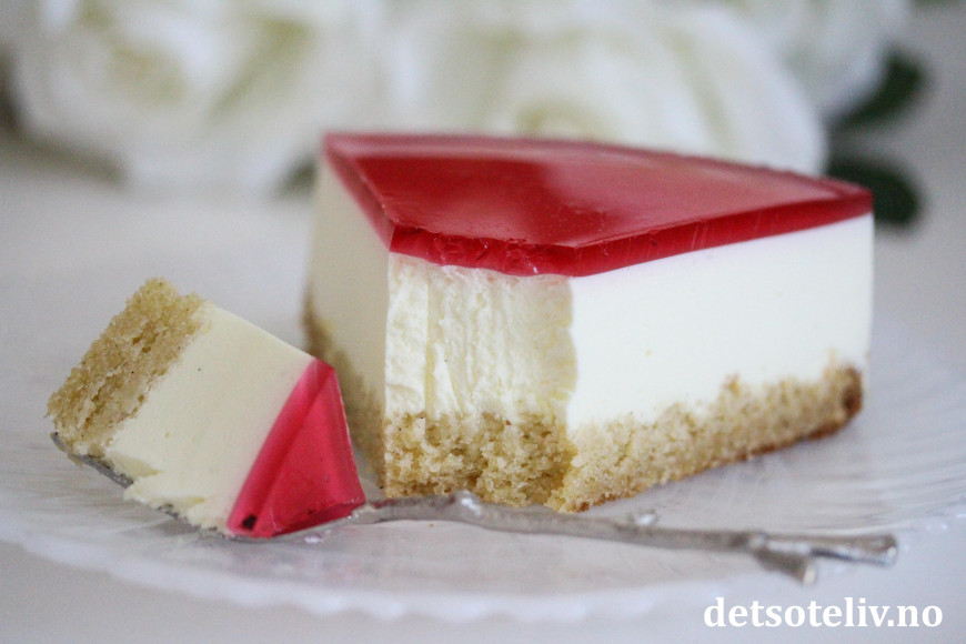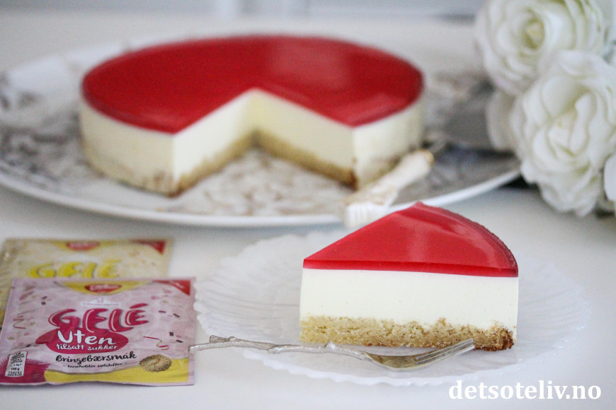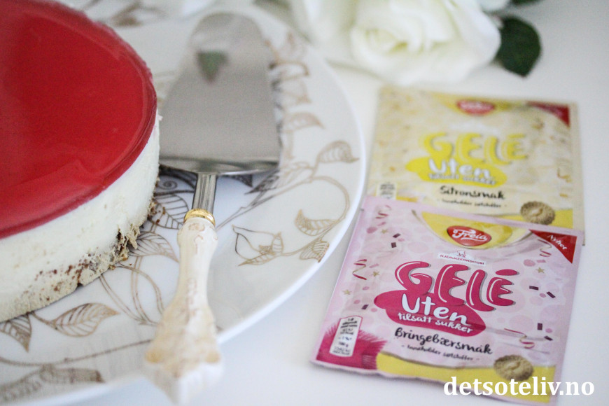 Dette er en lett og luftig fromasjkake med sitronsmak, som har vaniljekakebunn og bringebærgelé på toppen. Jeg har brukt Freia Gelé uten tilsatt sukker, som gjør at fromasjkaken får veldig redusert sukkerinnhold.