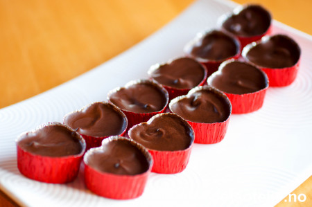 Fyll sjokoladeblandingen i små konfektformer ved hjelp at to teskjeer. Sett formene på et brett som passer i kjøleskapet. La stå kaldt til sjokoladen har stivnet.