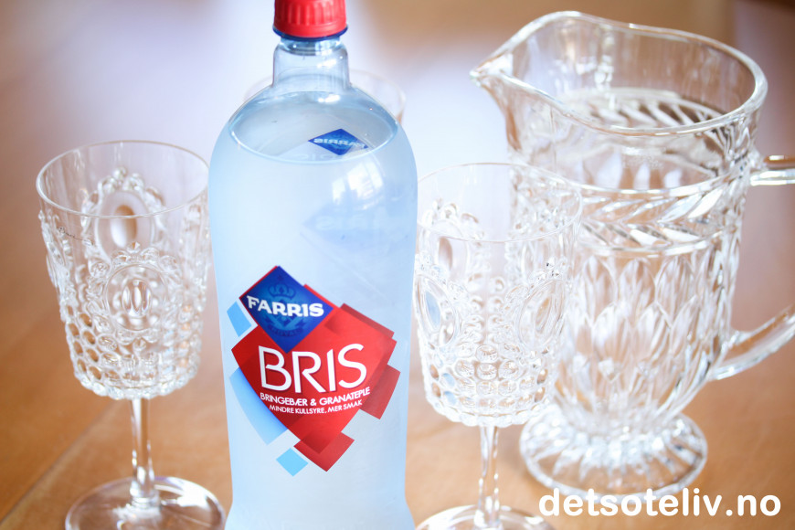 ♥ Jeg brukte Bris med smak av bringebær og granateple, og det ble supervellykket i denne drikken. Bris har litt mindre kullsyreinnhold enn vanlig Farris. Det går sikkert også veldig godt med Farris med sitronsmak, og vanlig Farris, Pellegrino eller helt enkelt kaldt vann går også bra!