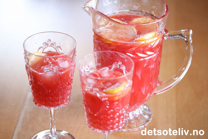 Før servering blander du saften i en stor mugge med vann, farris eller aller helst Bris med bringebærsmak hvis du får tak i (smak til vannmengden så du får passe styrke på saften). Tilsett sitronskiver og masse isbiter så drikken blir kald og god.