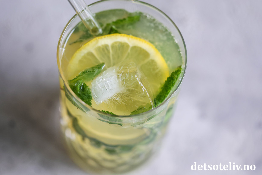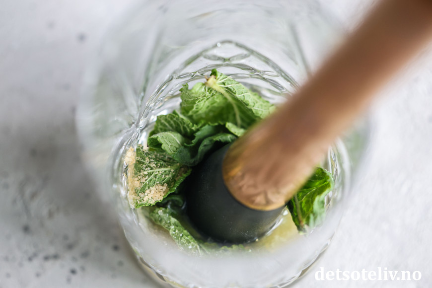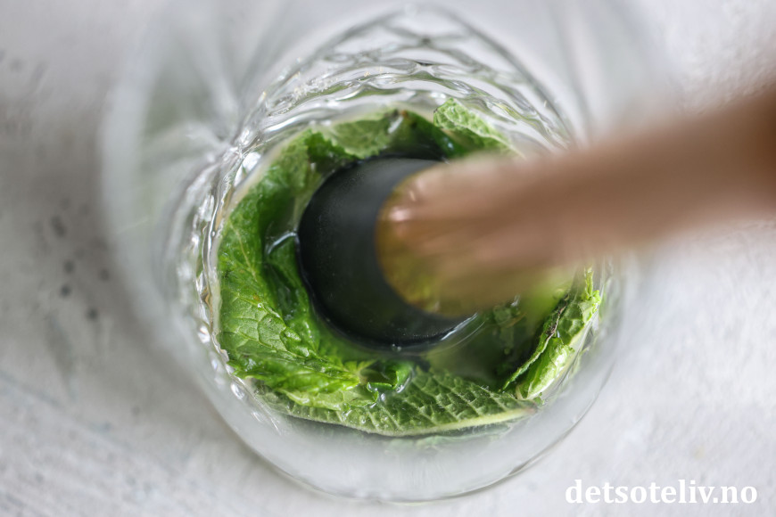 ♥ Vær litt forsiktig når du presser på myntebladene. Det er meningen å presse slik at aromaen fra myntebladene blander seg med sitronsaften og sukkeret, men ikke så hardt at myntebladene knuser for mye og blir til mos. Det skal helst være hele mynteblader igjen i glasset.