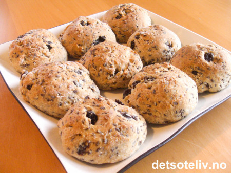 Legg bollene på bakepapirdekkede stekeplater. Etterhev bollene i 20 min. Stek bollene deretter pent gyldne midt i ovnen ved 210°C i ca 10 min.
