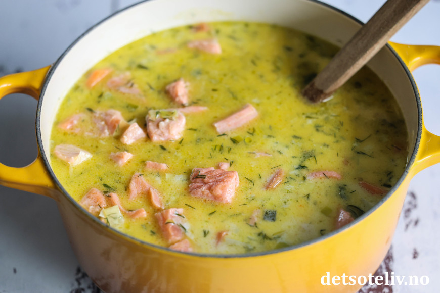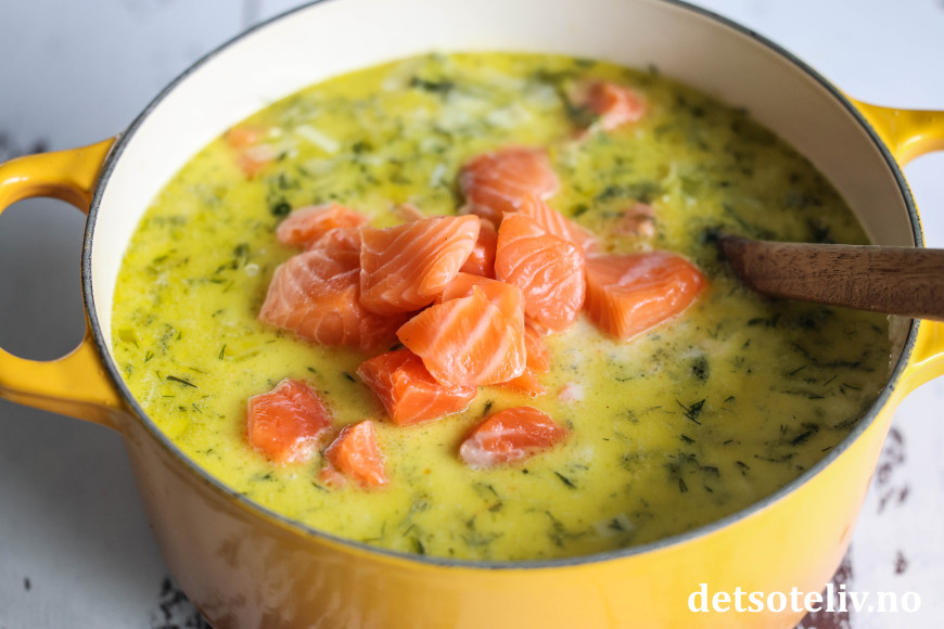♥ Laksesuppen blir best hvis du er nøye på å ikke overkoke laksebitene. De skal være så vidt gjennomkokte, men fortsatt veldig saftige. Det er derfor lurt å flytte kjelene med den varme suppen bort fra varmeplaten når du legger laksestykkene i suppen, slik at laksebitene kun trekker i den varme suppen og ikke koker.