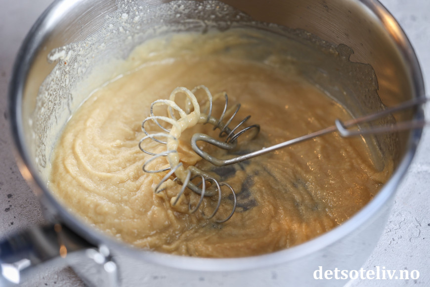 La det smelte og ta kjelen av platen. Tilsett hvetemelet og visp raskt rundt slik at jevningen blir klumpfri.