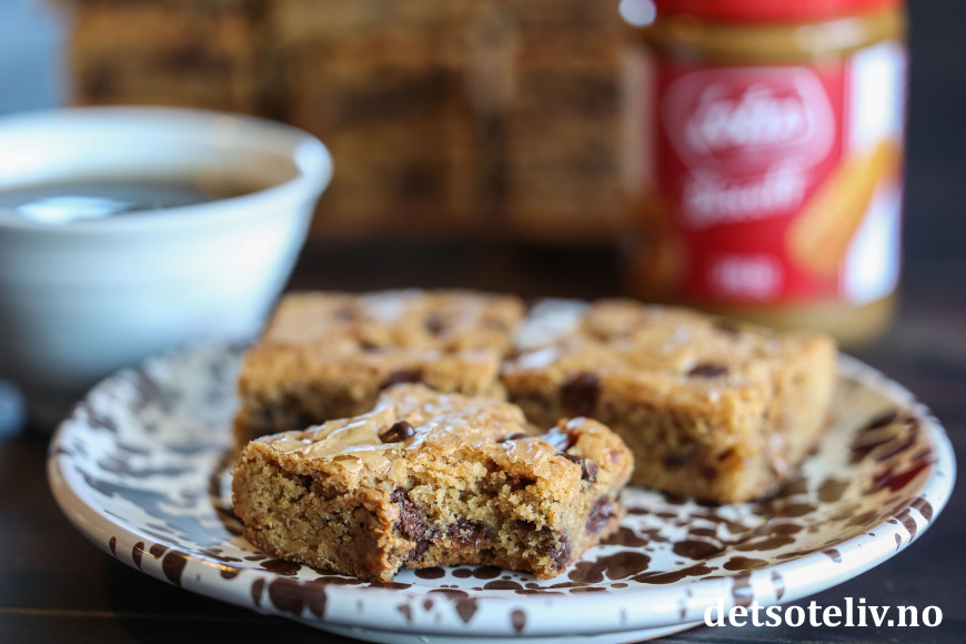 Herlige myke og litt seige Biscoff Blondies med søt og mildt krydret karamellsmak.