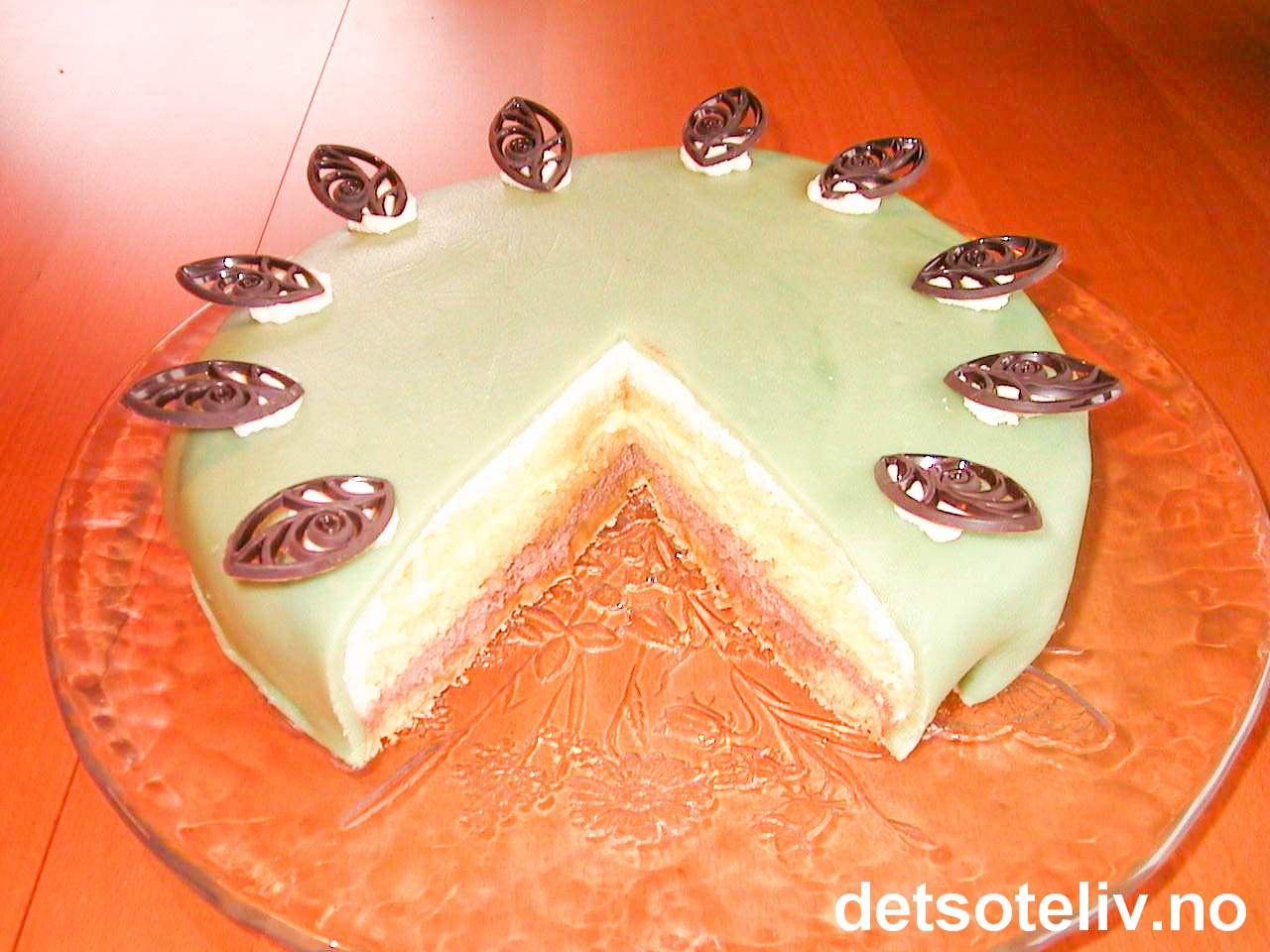 Fyll kaken med sjokoladekrem i det første kakelaget og vaniljekrem i det andre kakelaget. Dekk hele kaken med pisket krem (hold av litt til pynten). Ha over et grønt marsipanlokk (se tips). Pynt kaken med 12 kremdotter og 12 stk sjokoladeblonder.