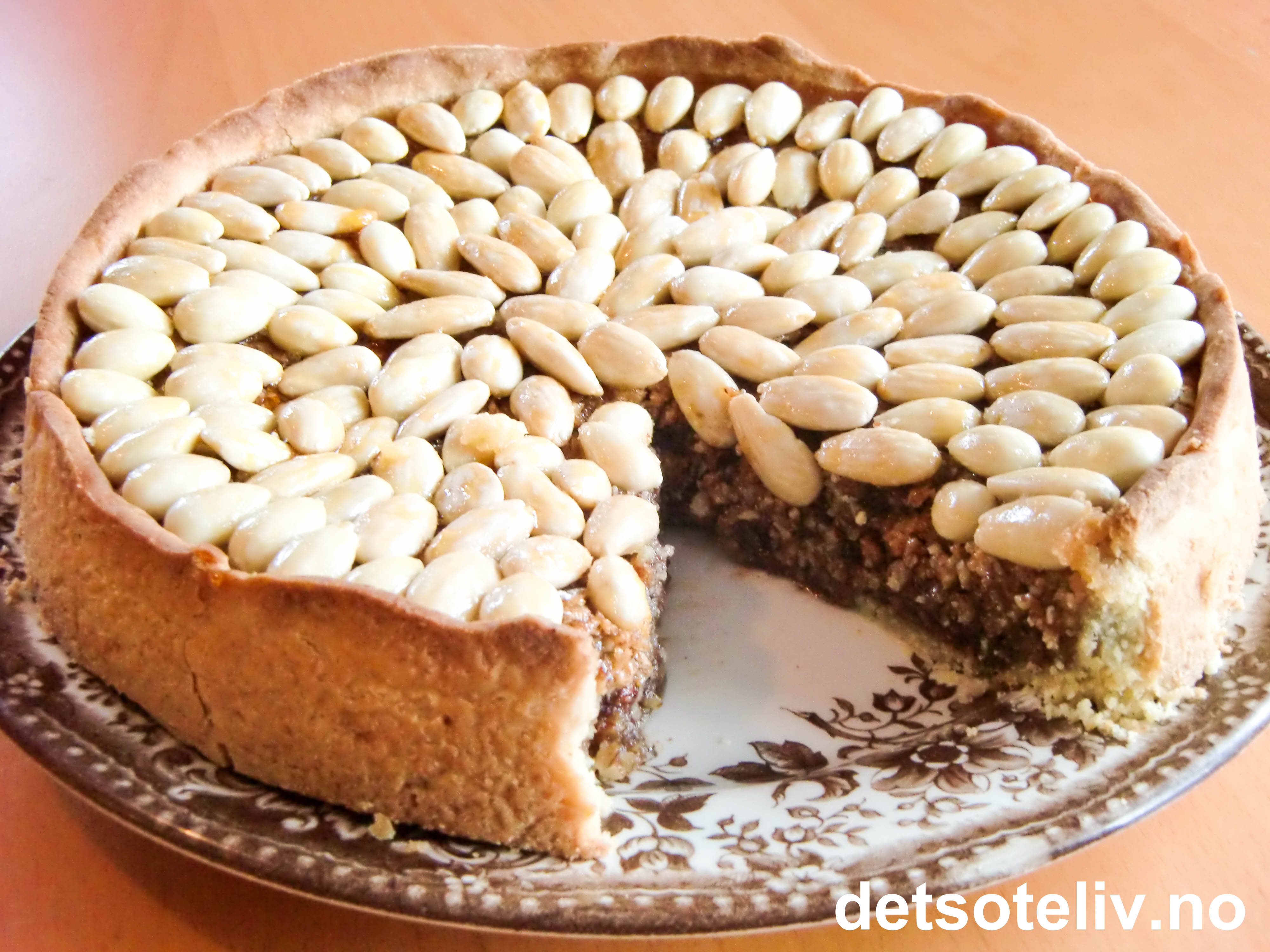 Til fyllet piskes egg og sukker til eggedosis. Tilsett malte mandler, mandellikør, krydder og bakepulver. Ha dette i kakeformen. Stek kaken midt i ovnen ved 200°C i ca 30 min. Ta kaken ut av ovnen og avkjøl noe. Legg skåldede mandler i pent mønster oppå kaken.