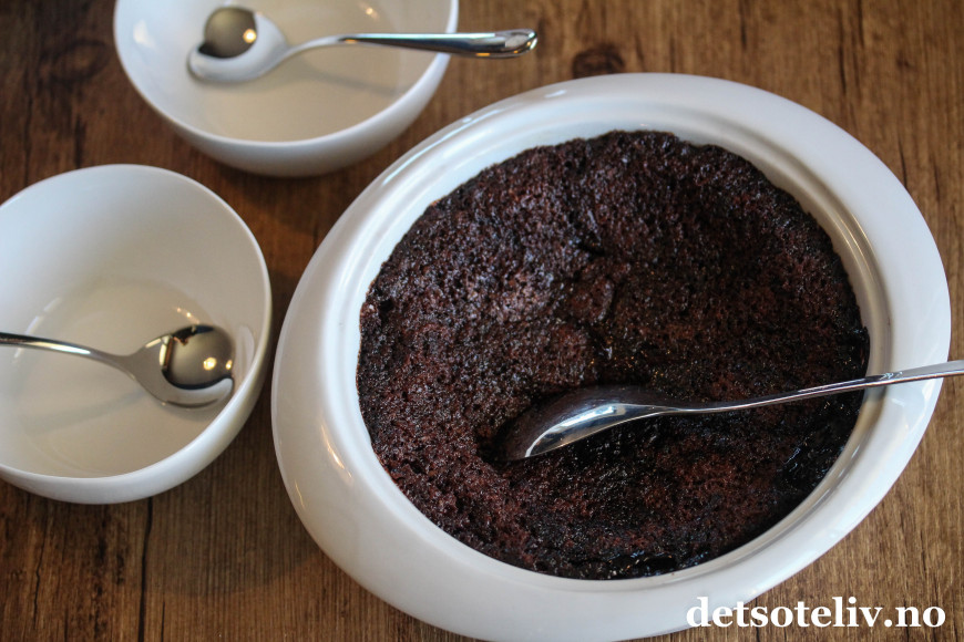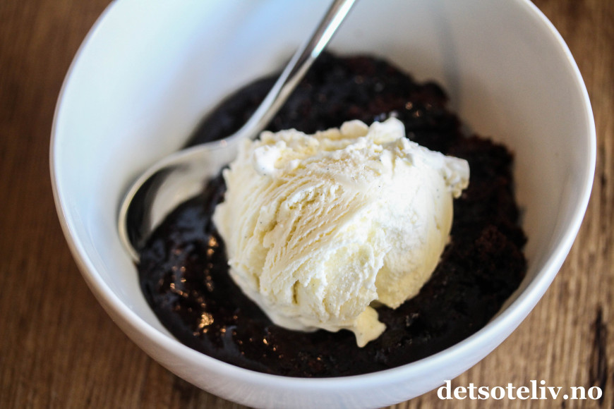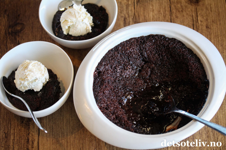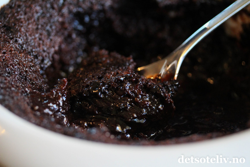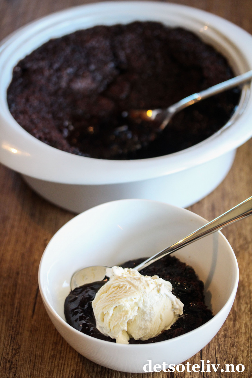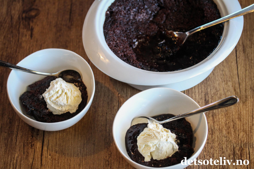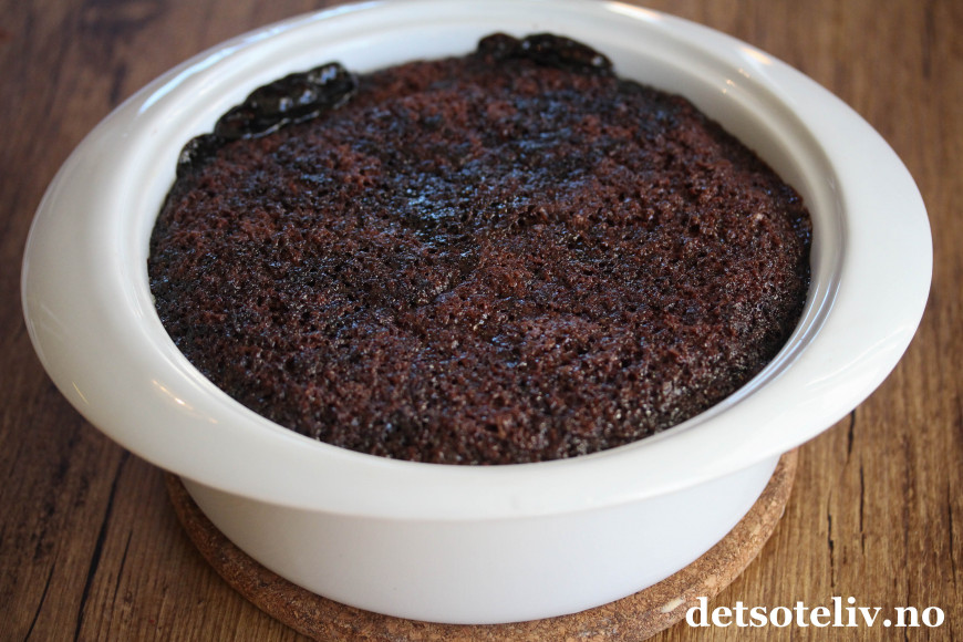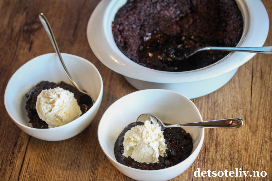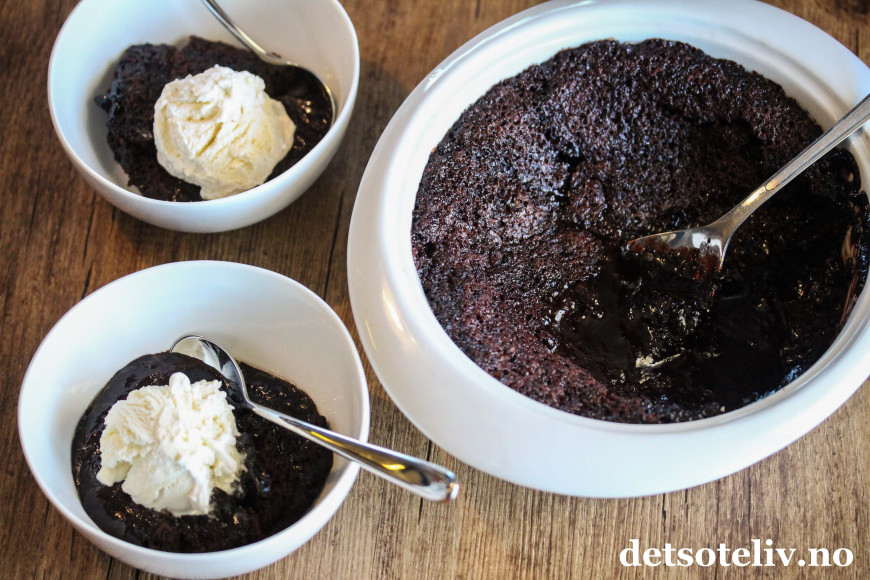 Denne spennende, amerikanske oppskriften gir en bløt sjokoladekake med flytende partier. Kaken kalles «Warm Chocolate Pudding Cake», men jeg har publisert oppskriftene «Floating Brownie» og «Devil’s float» tidligere, som ligner på denne.