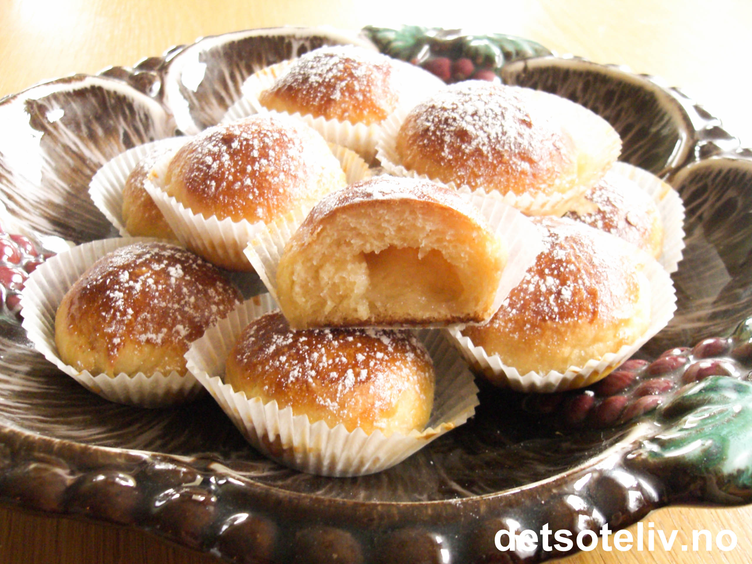 Del deigen i to deler. Kjevle hver del utover til avlange leiver (bruk litt ekstra mel til utbakingen). Skjær hver leiv i 15 firkanter. Legg en liten klatt med fyll i midten og brett kantene over fyllet. Klem til skjøtene slik at du får små, runde boller. Legg disse i muffinsformene.