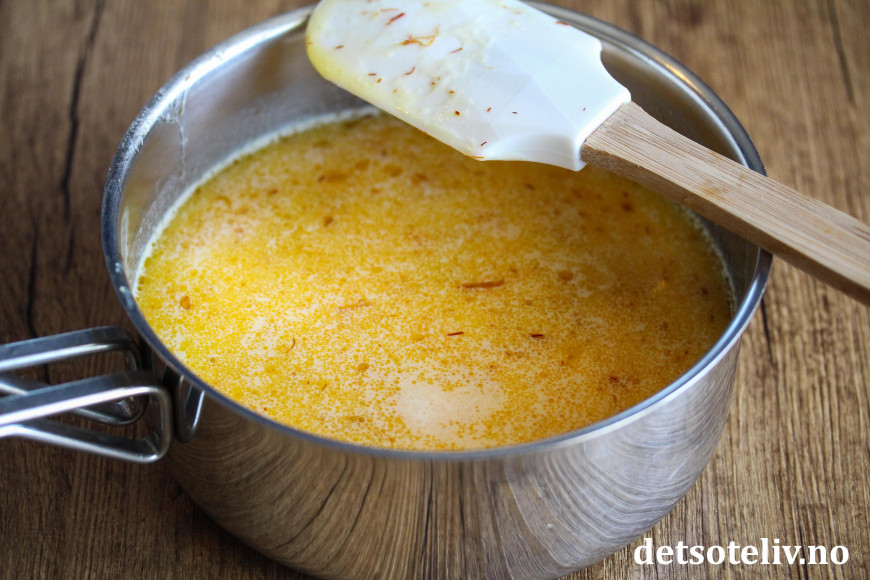 Tilsett safran. Bruker du safrantråder, knuses de først lett med litt sukker.