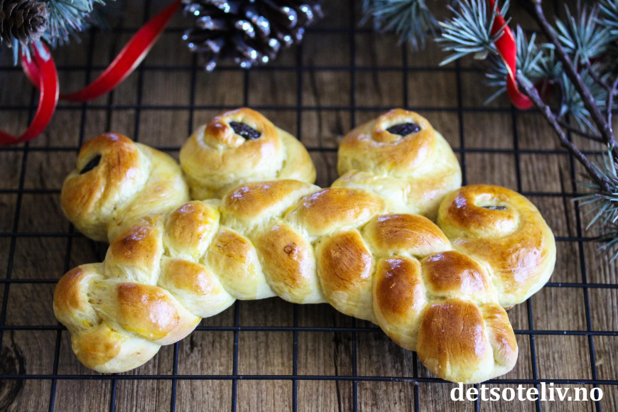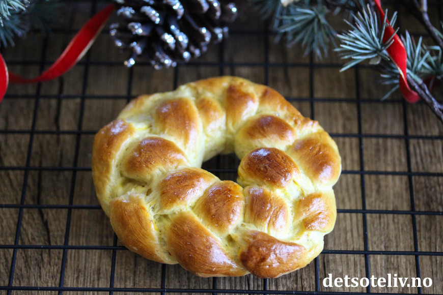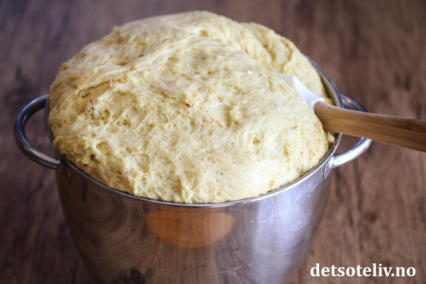 Smelt smøret. Bland med melken og varm opp blandingen til den er lunken (fingervarm). Tilsett safran. Bruker du safrantråder, knuses de først lett med litt sukker. Smuldre gjæren i en bakebolle, ha litt av smørmelken i bakebollen og rør til gjæren har løst seg opp. Tilsett resten av smørmelken, lett sammenpisket egg, sukker og kardemomme. Begynn så å blande inn det meste av melet og elt deigen til en jevn og smidig deig. La deigen heve tildekket i 1 time.