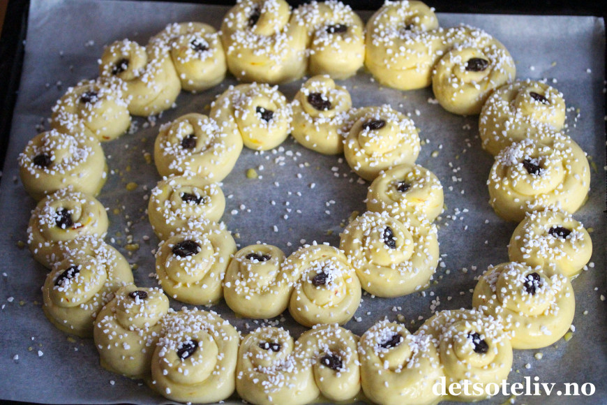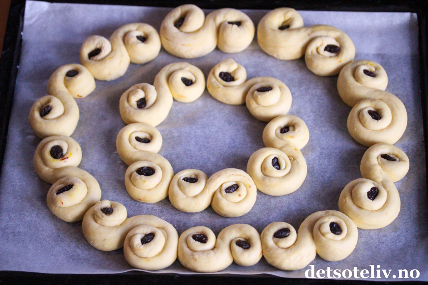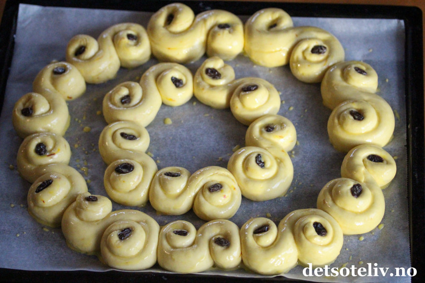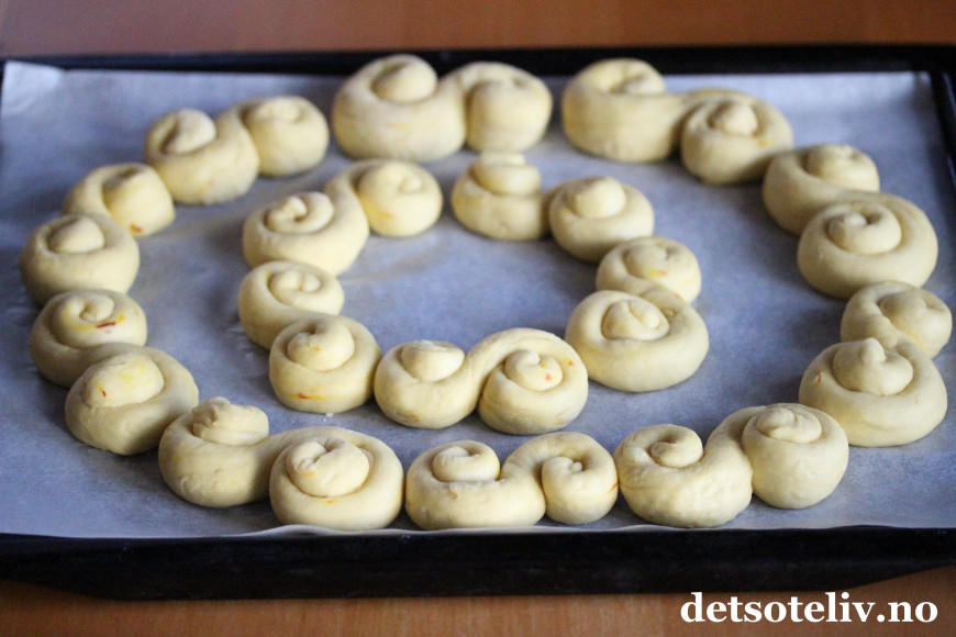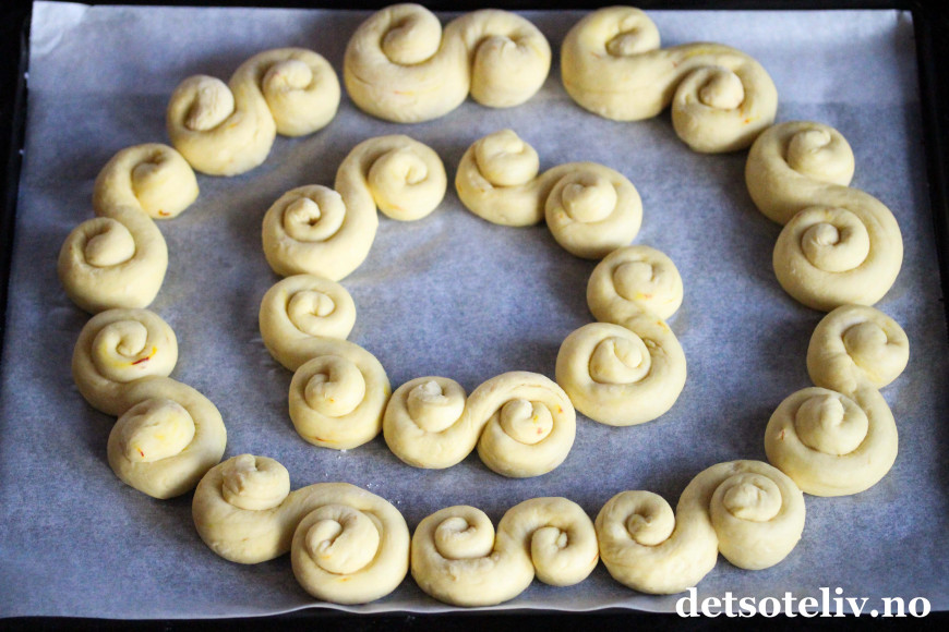 Husk at Lussekattene hever seg en god del under stekingen, så la det være litt luft mellom dem.