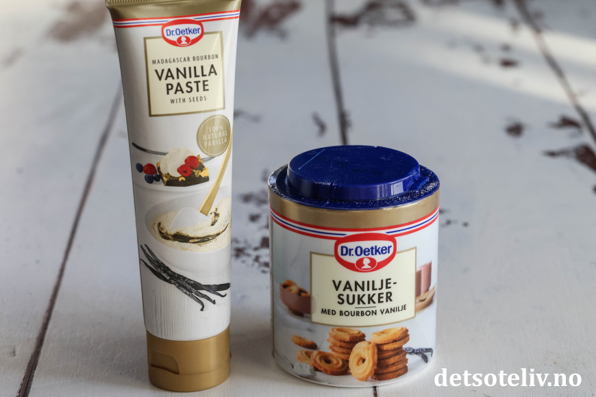 ♥ For å få god vaniljesmak på fyllet, bruker jeg ekte vaniljesukker (ja, det er riktig med 4 spiseskjeer 😊 ) og vaniljepasta, som er en mørk vaniljesirup som fås kjøpt i de fleste store matbutikkene. Fantastisk produkt! 😍 Har du ikke vaniljepasta, kan du bruke enda litt mer vaniljesukker.
