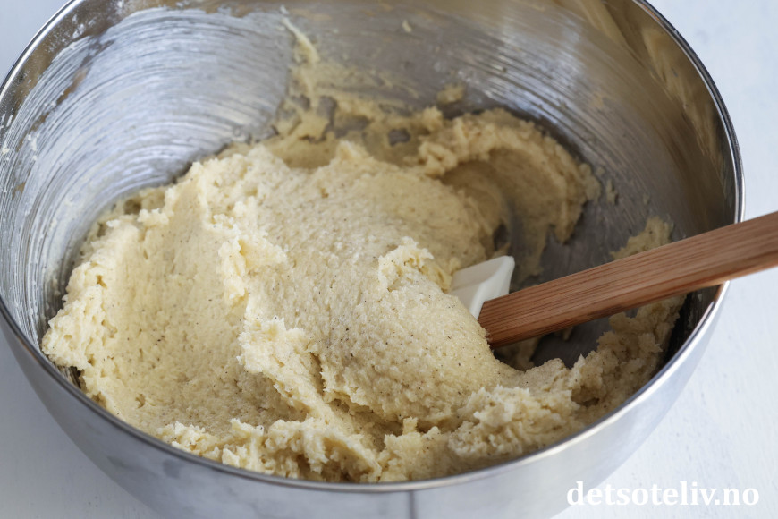 Ha mykt romtemperert smør, sukker, vaniljesukker og vaniljepasta i en bolle. Pisk dette godt sammen (jeg bruker elektrisk håndmikser til dette).